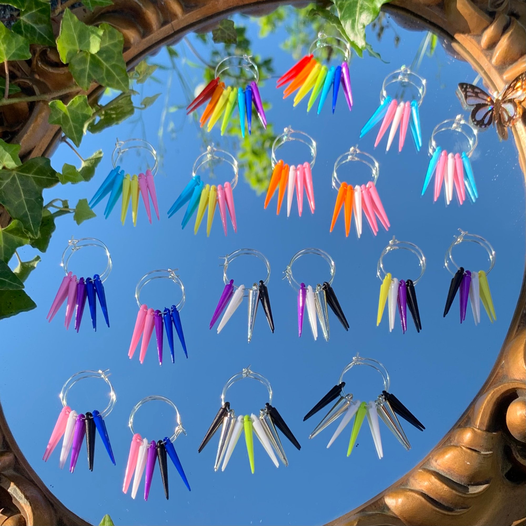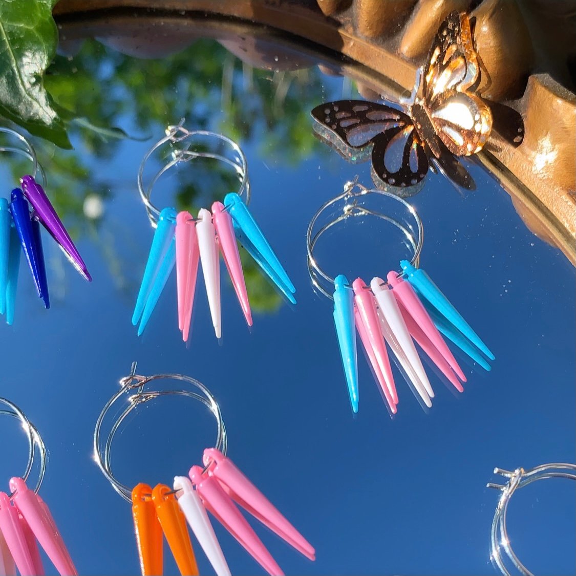 Handmade & lightweight acrylic spike earrings in pride flag colours, on silver plated hoops. Availability is very limited for certain options due to supply limitations.